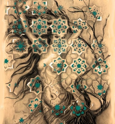 Vibrant acrylic artworks inspired by ancient eastern styles and modern techniques.